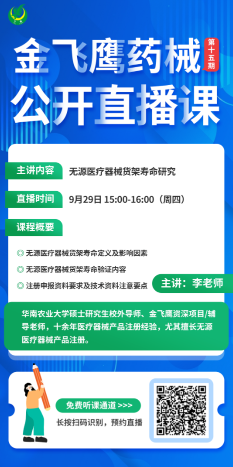 針對以上種種疑問,9月29日下午3點,金飛鷹資深項目/輔導老師、華南農業大學碩士研究生校外導師,有著十餘年醫療器械產品注冊經驗的李婷老師,為大家帶來《無源醫療器械貨架壽命研究》,培訓內容包括無源醫療器械貨架壽命定義及影響因素、無源醫療器械貨架壽命驗證內容、注冊申報資料要求及技術資料注意要點,千萬不要錯過啦!