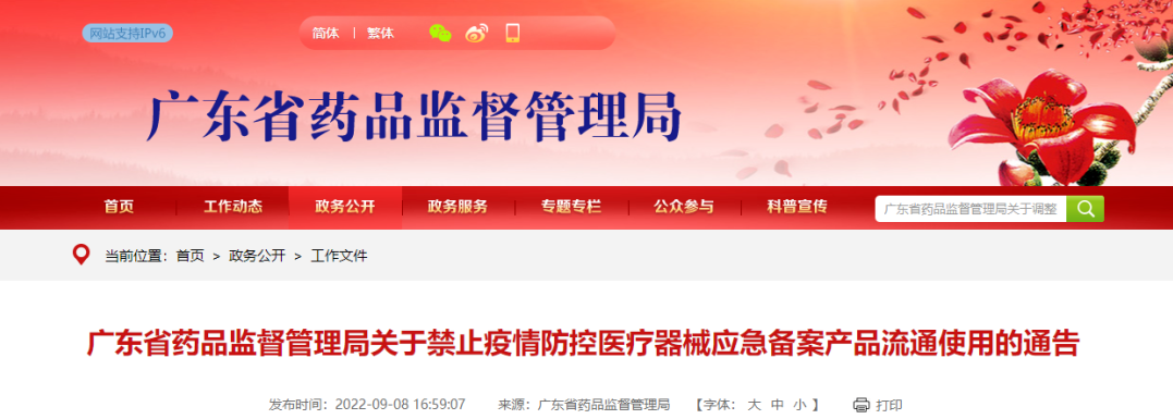 9月8日,廣東省藥監局發布關於禁止疫情防控醫療器械應急備案產品流通使用的通告,具體內容如下: