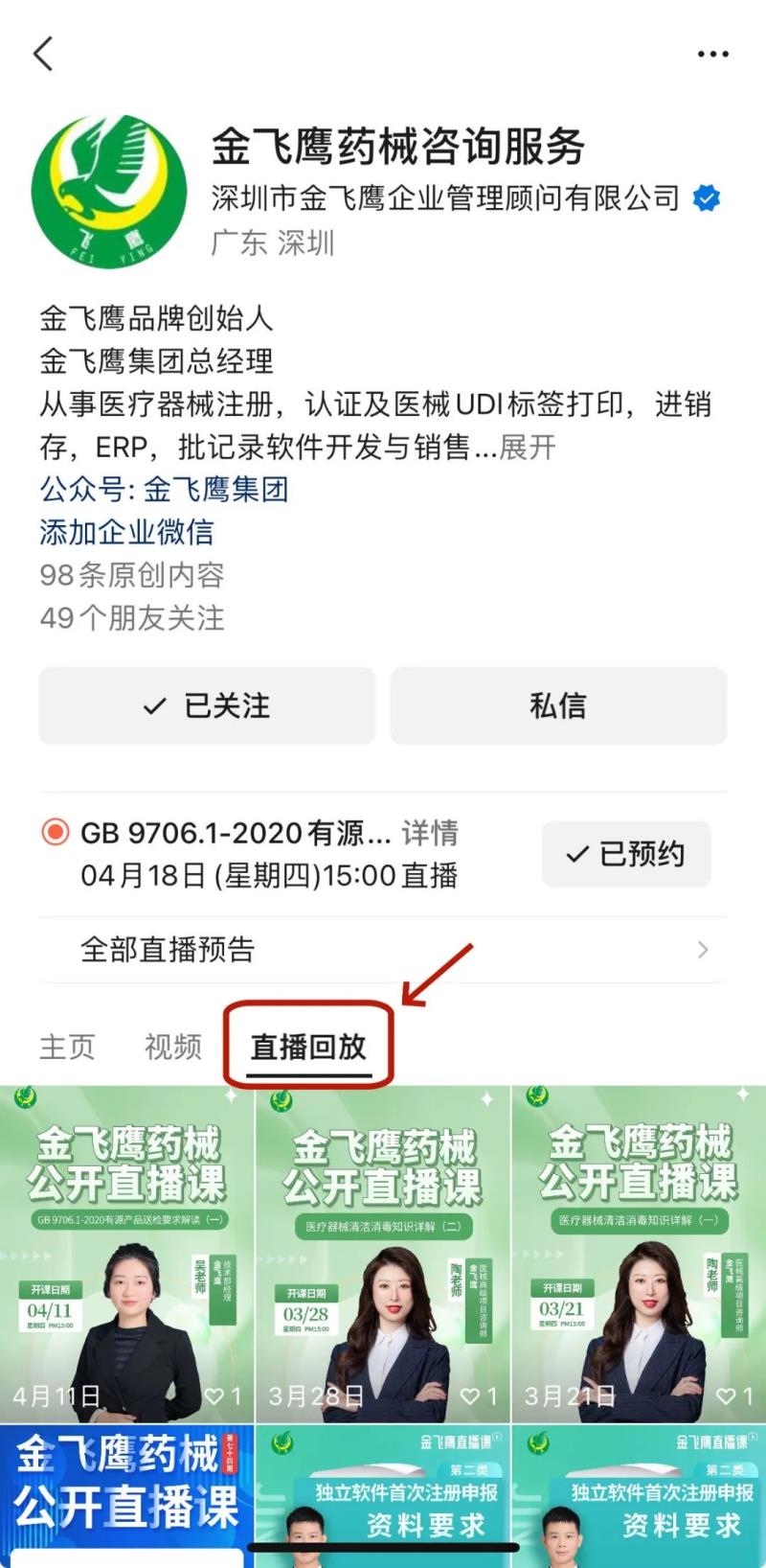 往期直播培訓課程支持回放,關注“金飛鷹藥械谘詢服務”視頻號並點擊視頻號主頁,即可查看“直播回放”哦~