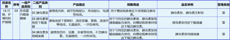 胰島素泵在我國屬於第三類醫療器械,其預期用途是“用於糖尿病患者皮下持續輸注胰島素。”胰島素泵需要配合皮下輸液器和儲液器一起使用,而根據《胰島素泵注冊審查指導原則》,一般情況下,胰島素泵與配合其使用的儲藥器、管路劃分為不同的注冊單元。就拿本次取證的產品來說,胰島素泵的分類編碼為14-03-02,胰島素泵用皮下輸液器和胰島素泵用儲藥器的分類編碼則分別為14-03-03及14-03-04。