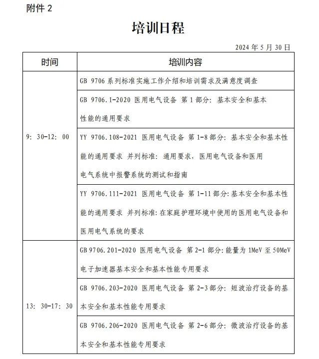 近日,北京市醫療器械檢驗研究院發布通知稱,該院定於2024年5月30日舉辦新版GB 9706係列標準線上宣貫培訓會,培訓內容包括GB 9706.1-2020《醫用電氣設備 第1部分:基本安全和基本性能的通用要求》、YY 9706.108-2021《醫用電氣設備 第1-8部分:基本安全和基本性能的通用要求 並列標準:通用要求,醫用電氣設備和醫用電氣係統中報警係統的測試和指南》、YY 9706.111-2021《醫用電氣設備 第1-11部分:基本安全和基本性能的通用要求並列標準:在家庭護理環境中使用的醫用電氣設備和醫用電氣係統的要求》等。培訓具體事項如下: