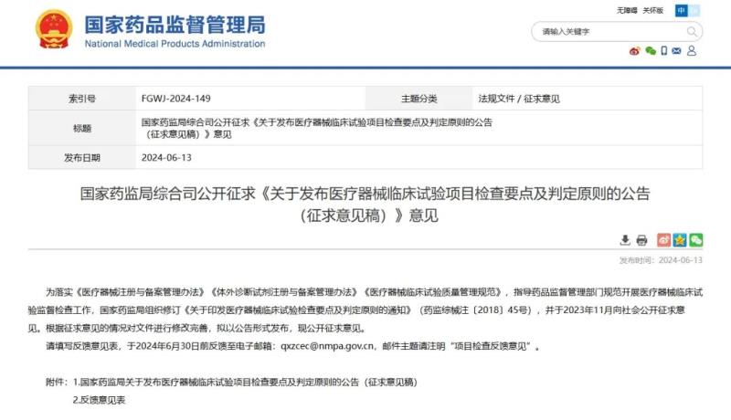 近日,國家藥監局發布《關於發布醫療器械臨床試驗項目檢查要點及判定原則的公告(征求意見稿)》(以下簡稱《公告》),並向社會公開征求意見。