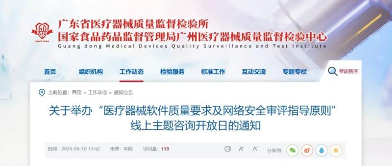 近日,廣東省醫療器械質量監督檢驗所官網發布通知稱,該所定於7月1日(周一)舉辦“醫療器械軟件質量要求及網絡安全審評指導原則”線上主題谘詢開放日活動,具體內容及參會方式如下:
