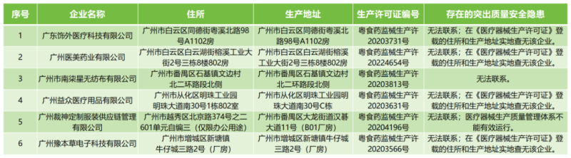 近日,廣州市市場監督管理局發布《關於公示存在突出質量安全隱患醫療器械生產企業的通告》,其中指出,廣東飾外醫療科技有限公司、廣州醫美藥業有限公司等6家醫療器械生產企業存在存在無法聯係、實地查無等突出質量安全隱患,具體名單如下: