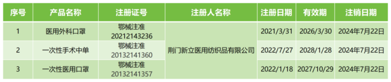 近日,湖北省藥監局發布了幾則注銷公告,其中提到,由於荊門新立醫用紡織品有限公司主動申請注銷其持有的幾張注冊證(含醫用外科口罩、一次性手術中單等產品),根據《醫療器械注冊與備案管理辦法》第六十三條規定,準予注銷並公布,具體明細如下: