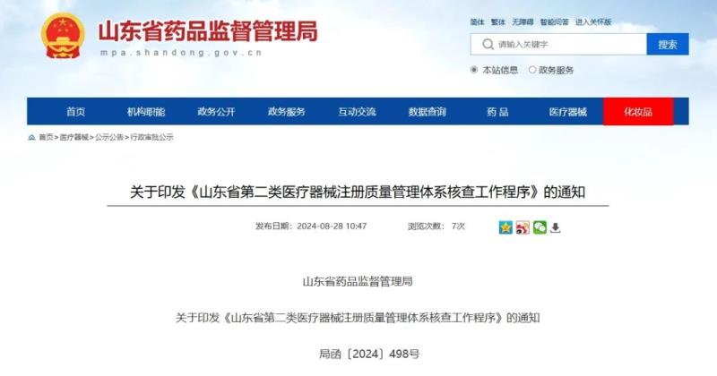 8月28日,山東省藥監局發布新版《山東省第二類醫療器械注冊質量管理體係核查工作程序》(以下簡稱《工作程序》),並宣布自發布之日(2024年8月28日)起施行。