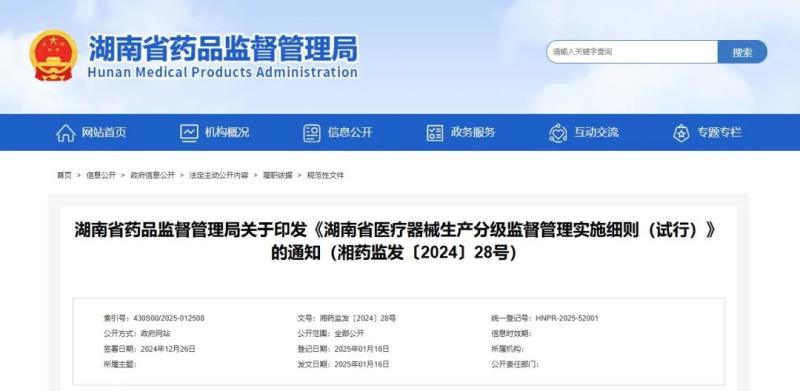 日前,湖南省藥監局發布《湖南省醫療器械生產企業分級監管實施細則(試行)》(以下簡稱《實施細則》),共三十六條,分別對製定依據、原則、適應範圍、職責分工、風險分級與評定、監管級別的確定與動態調整、監管要求等內容做出了詳細的規定。