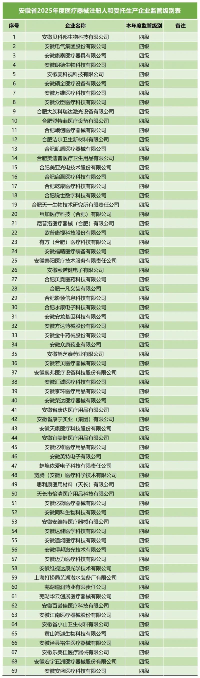 日前,安徽省藥監局公布了2025年度醫療器械注冊人和受托生產企業監管級別企業名單,我們通過查看附件發現,共有536家企業,其中有69家企業為四級監管,52家企業為三級監管,其餘415家企業為二級監管。我們將四級監管企業名單摘錄如下: