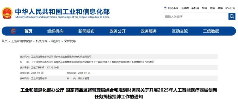 日前,工業和信息化部辦公廳、國家藥品監督管理局綜合和規劃財務司聯合印發《關於開展2025年人工智能醫療器械創新任務揭榜掛帥工作的通知》(工信廳聯科函〔2025〕30號)(以下簡稱《通知》),以推動人工智能技術與醫療器械深度融合發展,更好地服務和保障人民群眾生命健康,加快形成新質生產力。