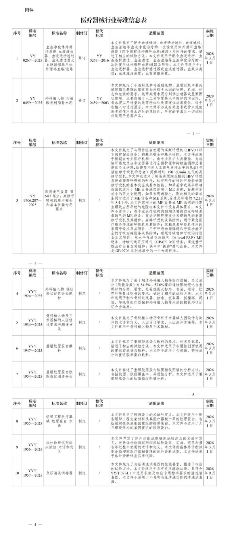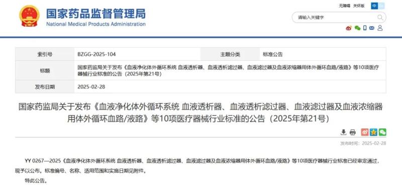 2月28日,國家藥監局發布YY 0267-2025《血液淨化體外循環係統 血液透析器、血液透析濾過器、血液濾過器及血液濃縮器用體外循環血路/液路》、YY 9706.287-2025《醫用電氣設備 第2-87部分:高頻呼吸機的基本安全和基本性能專用要求》、YY/T 1947-2025《重組膠原蛋白敷料》等10項醫療器械行業標準,其中2項標準為修訂,8項為製定,最早自2026年3月1日起實施,具體明細如下: