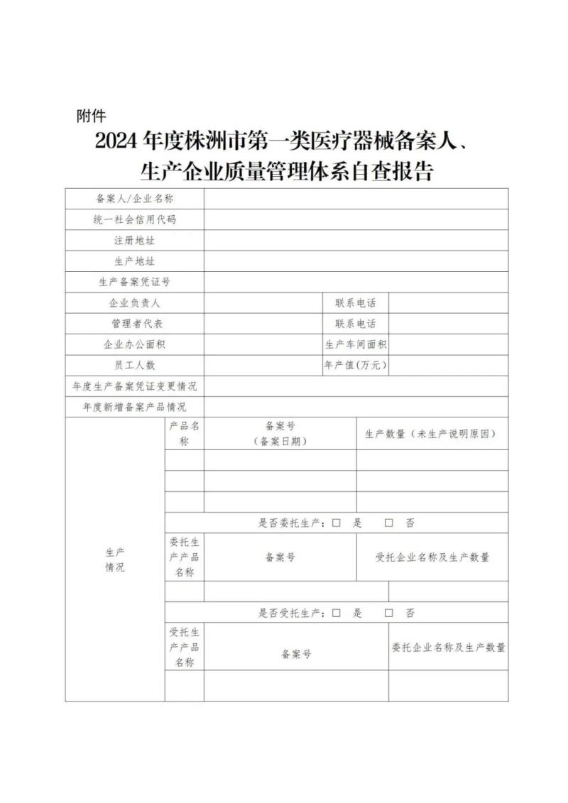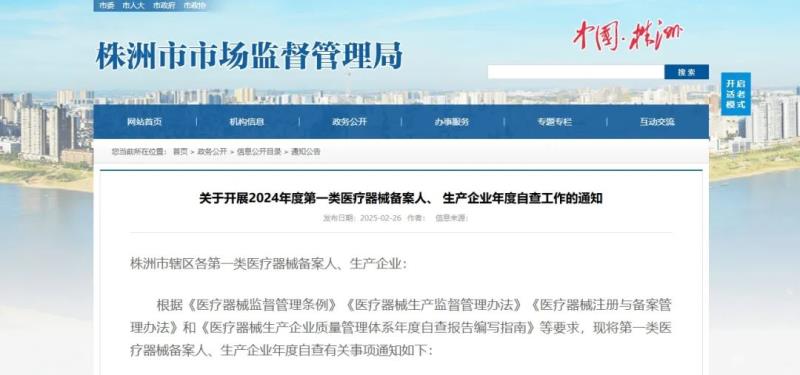 近日,株洲市市場監督管理局發布通知稱,全市範圍內第一類醫療器械備案人、生產企業應當於2025年3月31日前向株洲市市場監督管理局提交自查報告。