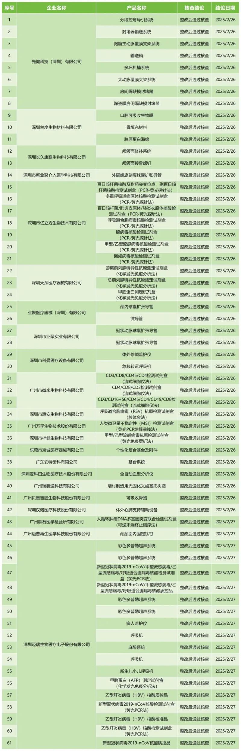 3月13日,廣東省藥監局官網公布2025年2月醫療器械注冊質量管理體係核查結果,包括深圳蘭度生物材料有限公司的膠原蛋白海綿、深圳市科曼醫療設備有限公司的體外除顫監護儀、廣州瑞鑫通科技有限公司的增材製造用光固化義齒基托樹脂、深圳邁瑞生物醫療電子股份有限公司的彩色多普勒超聲係統等共計61款產品,均為“整改後通過核查”。具體明細見下方表格: