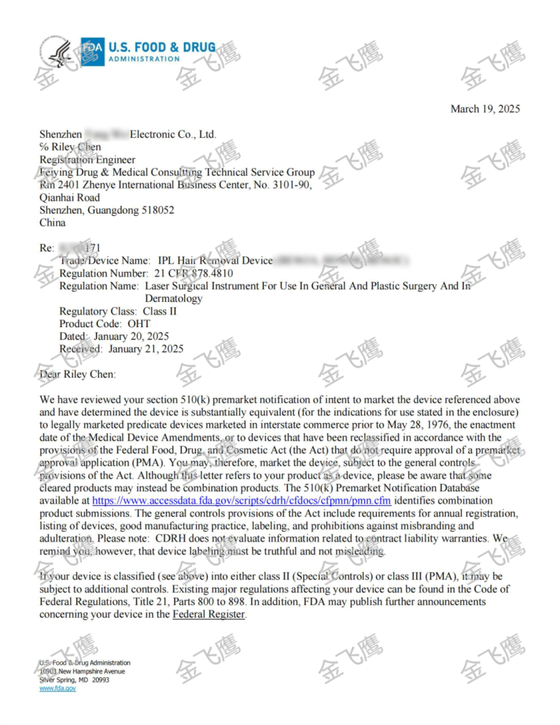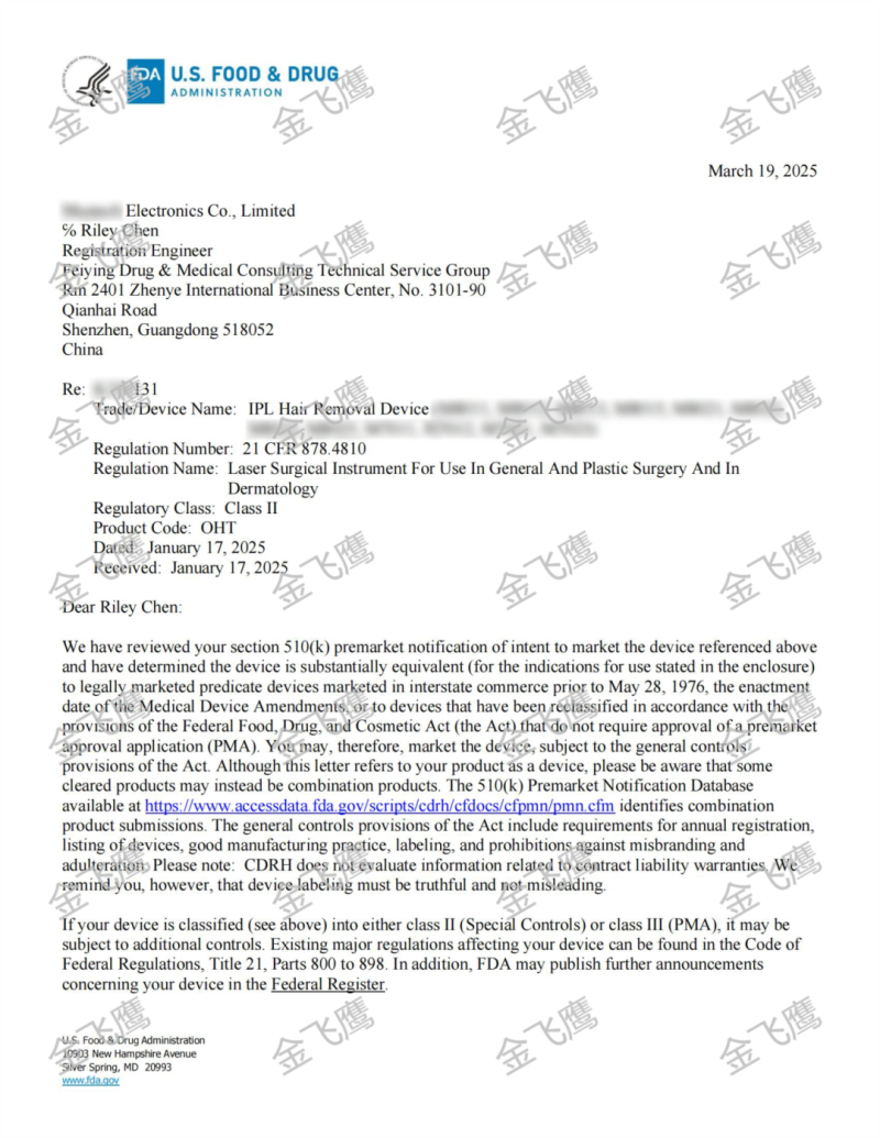 憑借我們深耕行業18年的深厚積澱與卓越的技術實力,近日金飛鷹連續輔導多家企業的多款產品獲批FDA 510(k),其中包括氣壓腿部按摩器、SGRT係統以及今天的主角——我們申請的首例雙脈衝脫毛儀。這一係列成功案例,不僅彰顯了我們在醫療器械注冊谘詢領域的專業實力和行業領軍地位,更為國內醫械企業加速布局海外市場提供了堅實的技術支持與戰略保障。