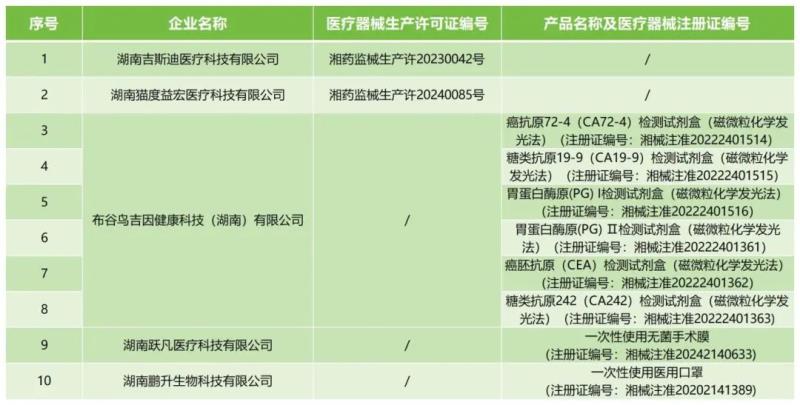 4月11日,湖南省藥監局發布公告稱,按照《醫療器械監督管理條例》《醫療器械生產監督管理辦法》有關規定,根據企業申請,現注銷湖南吉斯迪醫療科技有限公司等2家企業的醫療器械生產許可證;注銷布穀鳥吉因健康科技(湖南)有限公司、湖南躍凡醫療科技有限公司等3家企業的8個產品的醫療器械注冊證,具體明細如下: