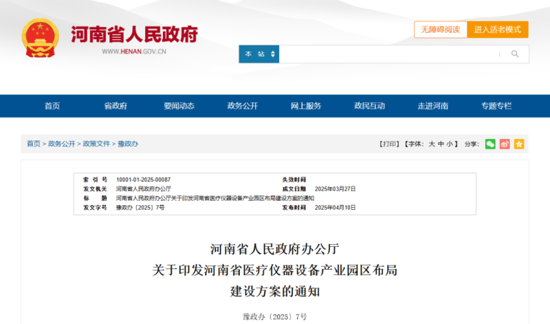近日,河南省人民政府發布辦公廳《河南省醫療儀器設備產業園區布局建設方案》(以下簡稱《方案》),《方案》明確,將依托國家級和省級開發區,重點規劃建設7個專業化、高端化醫療儀器設備產業園區,推動產業鏈上下遊集聚,構建“一區一園一主業”的協同錯位發展格局。