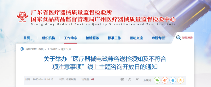 近日,廣東省醫療器械質量監督檢驗所官網發布通知,定於4月25日(周五)舉辦“醫療器械電磁兼容送檢須知及不符合項注意事項”線上主題谘詢開放日活動,具體時間及參會方式如下: