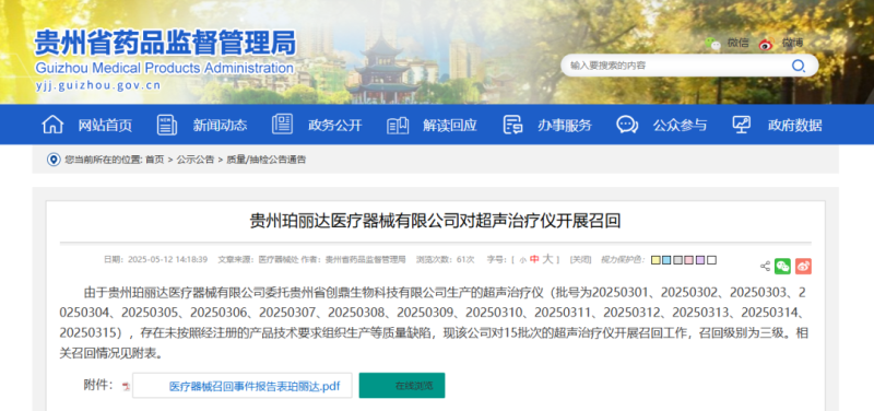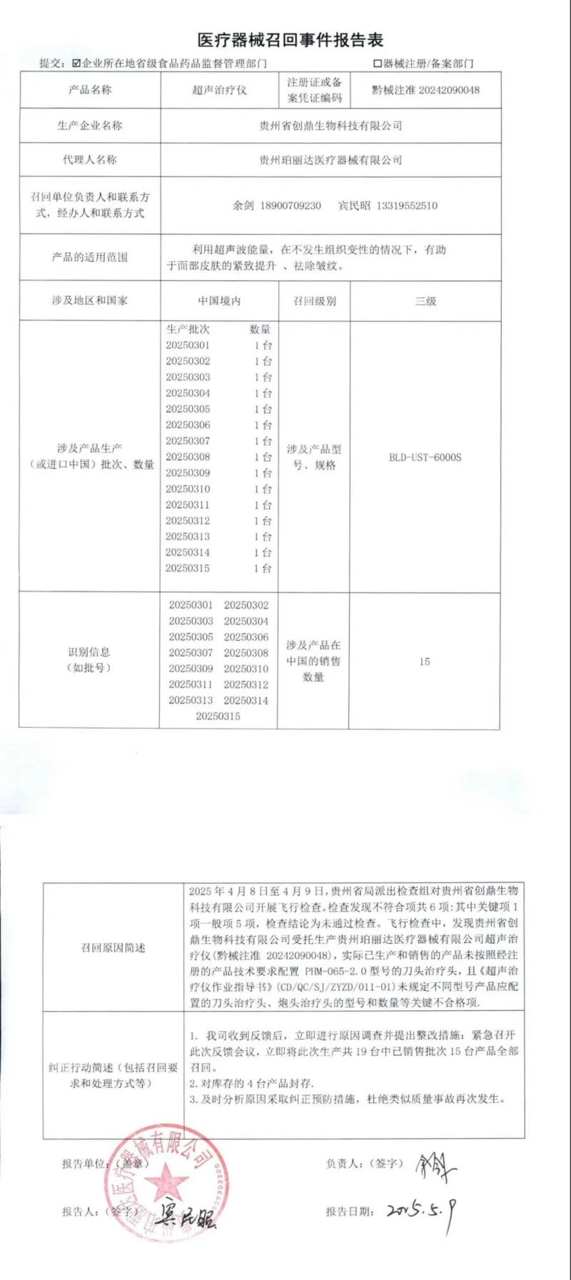 5月12日,貴州省藥監局發布一則召回公告,其中提到,由於貴州珀麗達醫療器械有限公司委托貴州省創鼎生物科技有限公司生產的超聲治療儀(產品適用範圍:利用超聲波能量,在不發生組織變性的情況下,有助於麵部皮膚的緊致提升、祛除皺紋),存在未按照經注冊的產品技術要求組織生產等質量缺陷,現該公司對15批次的超聲治療儀開展召回工作,召回級別為三級。具體召回情況如下: