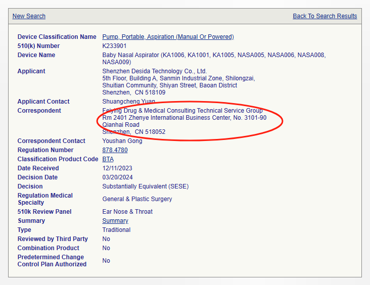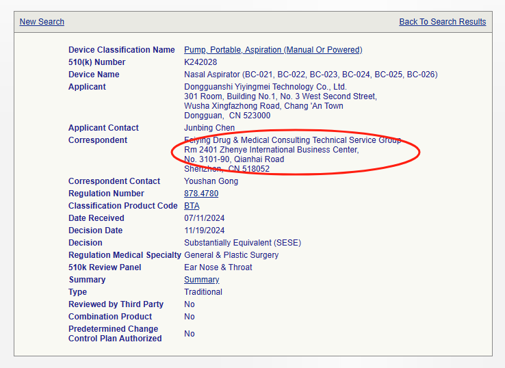 我們在FDA 510(k)數據庫用產品代碼BTA進行檢索,近兩年來由金飛鷹申報並作為官方Correspondent的有如下企業的吸鼻器產品: