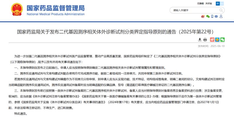 6月10日,國家藥監局發布《二代基因測序相關體外診斷試劑分類界定指導原則》(以下簡稱《指導原則》),並就《指導原則》實施的有關事項通告如下:
