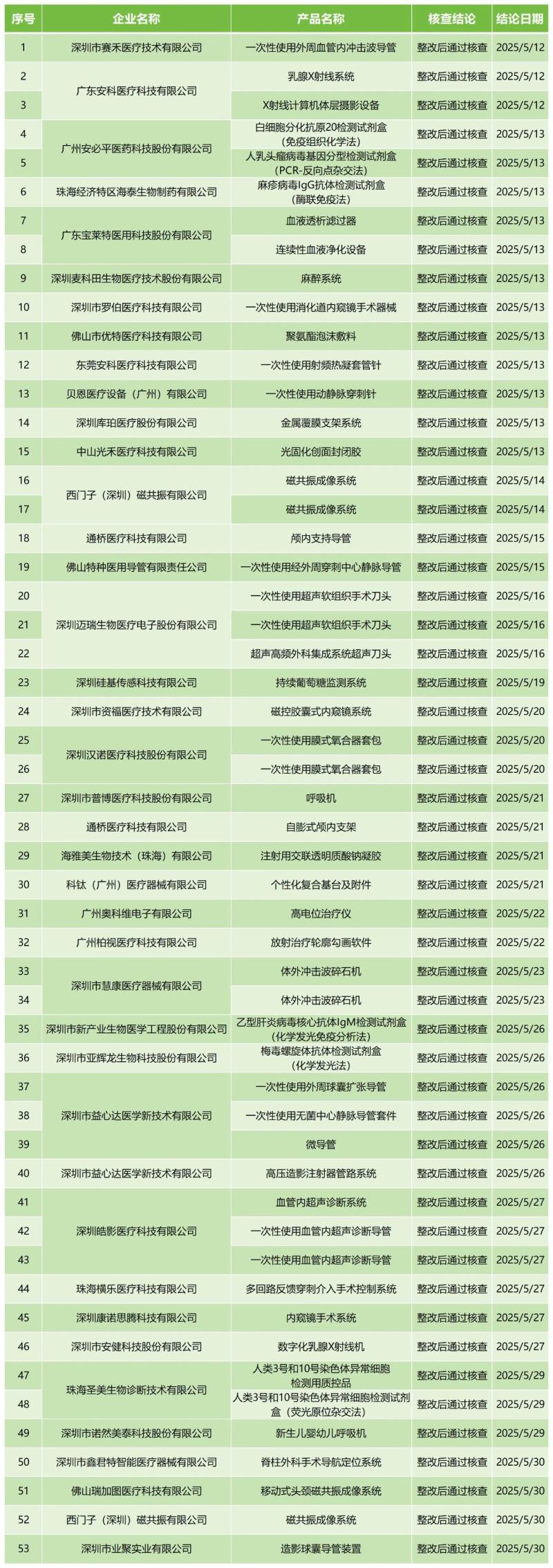 6月27日,廣東省藥監局官網公布2025年5月醫療器械注冊質量管理體係核查結果,包括深圳矽基傳感科技有限公司的持續葡萄糖監測係統海雅美生物技術(珠海)有限公司注射用交聯透明質酸鈉凝膠、廣州奧科維電子有限公司的高電位治療儀廣州柏視醫療科技有限公司的放射治療輪廓勾畫軟件共計53款產品,均為“整改後通過核查”。具體明細見下方表格: