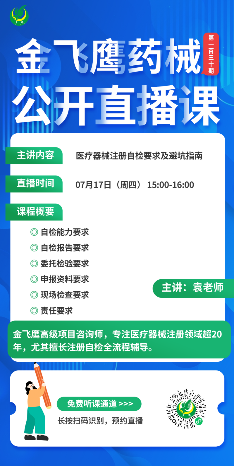 7月17日下午3點,金飛鷹高級項目谘詢師,專注醫療器械注冊領域超20年,尤其擅長注冊自檢全流程輔導的袁老師給大家帶來《醫療器械注冊自檢要求及避坑指南》,在一一梳理注冊自檢各方麵要求的同時,還會結合過往的實際輔導案例給大家總結避坑指南及現場核查應對策略感興趣的朋友記得提前預約!
