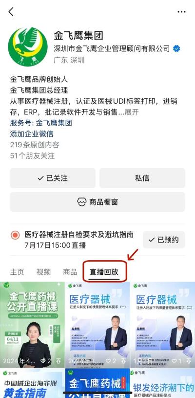 往期直播培訓課程支持回放,關注“金飛鷹藥械谘詢服務”視頻號並點擊視頻號主頁,即可查看“直播回放”哦~