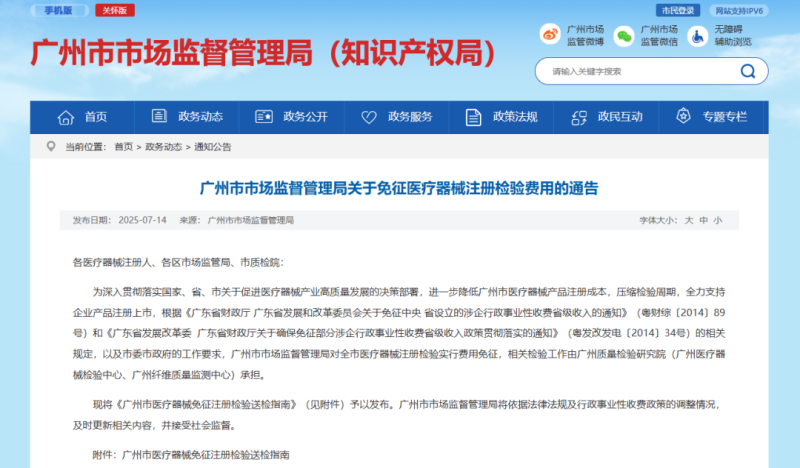 7月14日,廣州市市場監督管理局發布《廣州市醫療器械免征注冊檢驗送檢指南》(以下簡稱《指南》)對全市醫療器械注冊檢驗實行費用免征,相關檢驗工作由廣州質量檢驗研究院(廣州醫療器械檢驗中心、廣州纖維質量監測中心)承擔。