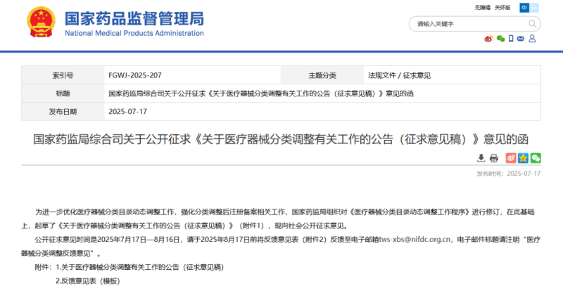 7月17日,國家藥監局發布《關於醫療器械分類調整有關工作的公告(征求意見稿)》(以下簡稱《分類調整公告》),現向社會公開征求意見。