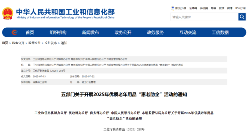 近日,國家工信部、民政部等五部門發布《關於開展2025年優質老年用品‘惠老助企’活動的通知》(以下簡稱《通知》),以全麵落實國務院辦公廳《關於發展銀發經濟增進老年人福祉的意見》,持續推動老年用品增品種、提品質、創品牌,大力提升老年用品供需適配能力。《通知》具體內容如下: