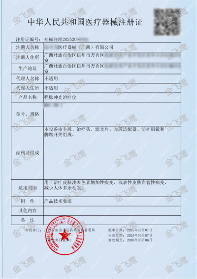 強脈衝光治療儀,亦稱IPL脫毛儀,在我國《醫療器械分類目錄》中,其產品描述為:“通常由孤光燈光源、光路係統、濾光裝置、控製裝置、放電電容和冷卻係統等組成。通過可見波段部分近紅外波段強脈衝或脈衝串輻射照射體表,利用選擇性光熱光化學作用進行治療。”預期用途如下:“用於改善皮膚外觀治療、血管性疾病、皮膚表淺的色素性疾病及減少毛發的治療。此類產品在我國作為第二類醫療器械管理,在美國、沙特,也作為第二類醫療器械管理。