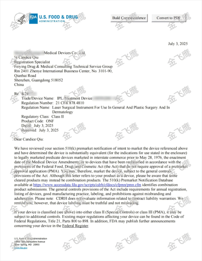 關注我們的朋友想必已經注意到,我們在脫毛儀510(k)注冊領域的成就同樣極為亮眼。由於成功案例實在太多,很多新取得的K號甚至都來不及一一宣傳。值此機會,我們特別精選兩張今年7月新出的K號與大家分享,更多脫毛儀510(k)成功案例,歡迎點擊右側鏈接查看☞IPL脫毛儀510(k)
