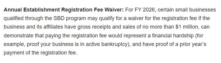 不過在費用普漲的同時,FDA也釋放出了給企業減負的信號:2026財年,FDA給小企業提供了 免年費 的選項,前提是這些企業證明支付費用會給他們帶來經濟困難,具體條件如下: