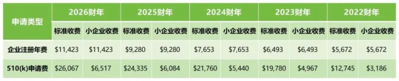具體來說,企業注冊年費漲至$11423,相比2025財年的$9280上漲了$2143,漲幅23.1%;相比而言,510(k)申請費的漲幅則要稍小一些:其中510(k)申請標準收費漲至$26067,小企業的510(k)申請費則為6517美元,漲幅均為7.1%。
