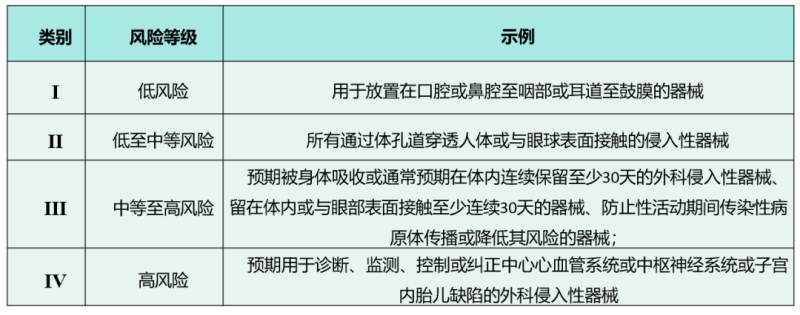 在《醫療器械注冊指南》中,加納FDA根據產品風險從低到高,將醫療器械分為Ⅰ、Ⅱ、Ⅲ、Ⅳ四個風險等級。下表列出了醫療器械的四個風險類別,企業可根據示例內容對產品類別進行大致判斷。另外在《醫療器械注冊指南》中,還列出了醫療器械分類的16條具體規則,根據這些規則可以更明確地判斷產品類別。