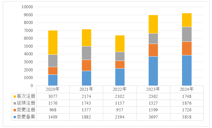 按受理注冊類型區分,2024年受理首次注冊1748項,同比降低26.0%;受理延續注冊1876項,同比增加41.4%;受理變更注冊1726項,同比增加7.9%;受理變更備案3858項,同比增加4.4%。