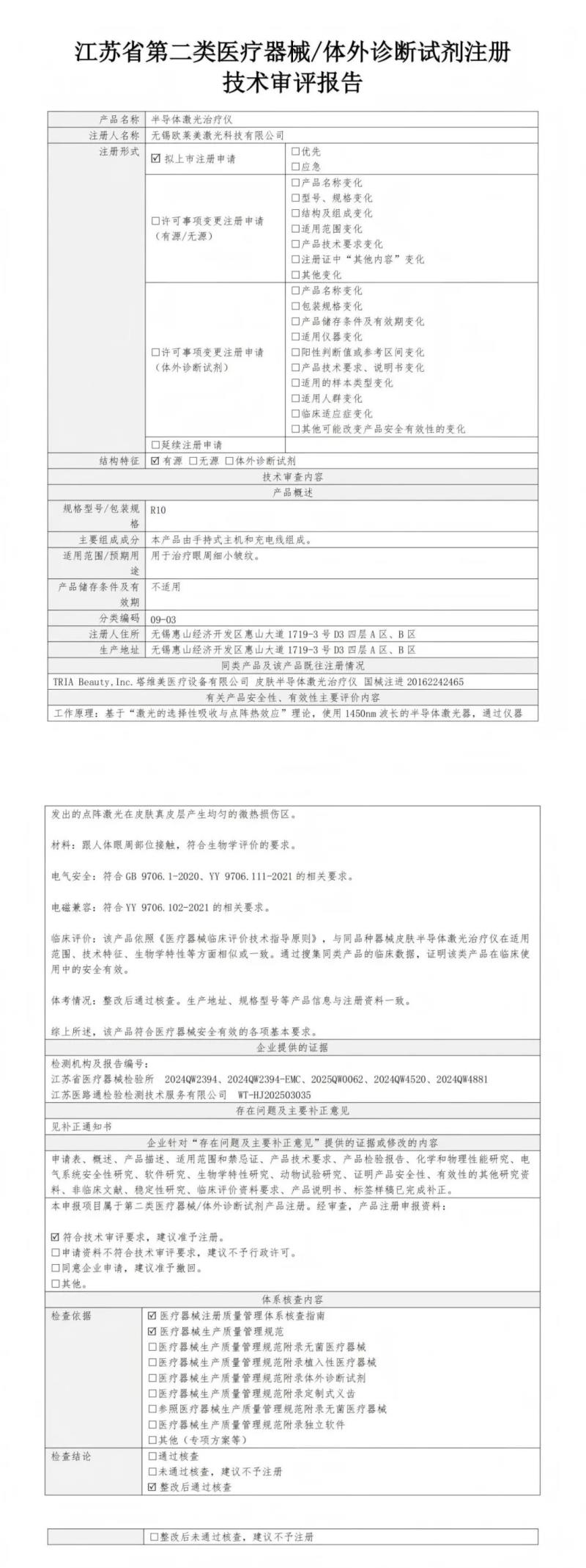 8月12日,江蘇省藥監局公布了2025年7月批準注冊的神經肌肉電刺激儀、醫用分子篩製氧機、半導體激光治療儀、紅藍光治療儀、全自動衝擊波治療儀、醫用絲素蛋白凝膠敷料、超聲波治療儀、醫用重組膠原蛋白液體敷料、醫用壓縮式霧化器、一次性醫用激光光纖136醫療器械產品目錄,同時隨附了所有產品的技術審評報告,我們將其中“半導體激光治療儀預期用途:用於治療眼周細小皺紋的技術審評報告以圖片形式轉載如下: