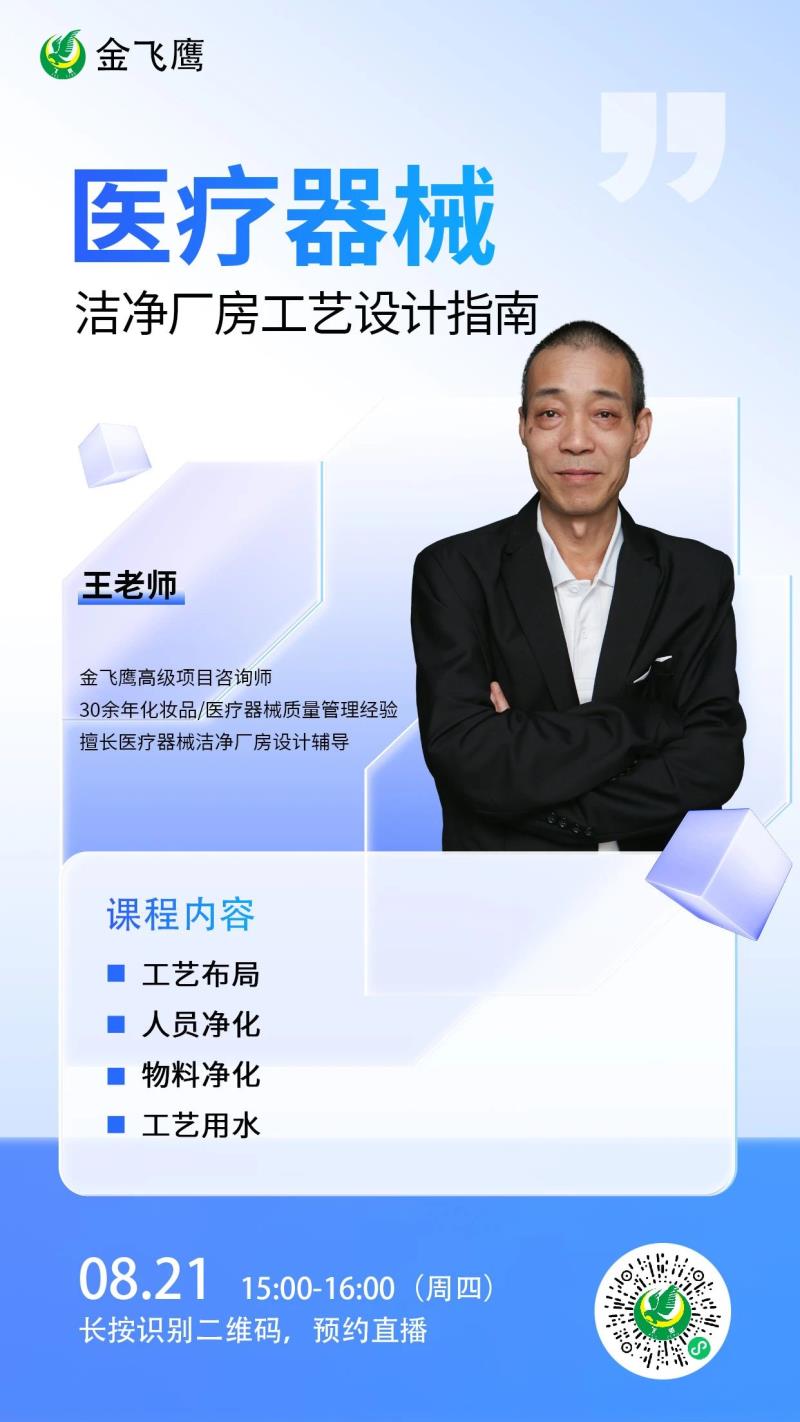 8月21日下午3點,金飛鷹高級項目谘詢師,有著30餘年化妝品/醫療器械質量管理經驗,尤為擅長醫療器械潔淨廠房設計輔導的王老師給大家帶來《醫療器械潔淨廠房工藝設計指南》,無論您是正在規劃新的生產場地,還是希望提升現有廠房的運行效率,都能從課程中獲得專業指導,感興趣的朋友記得提前預約!