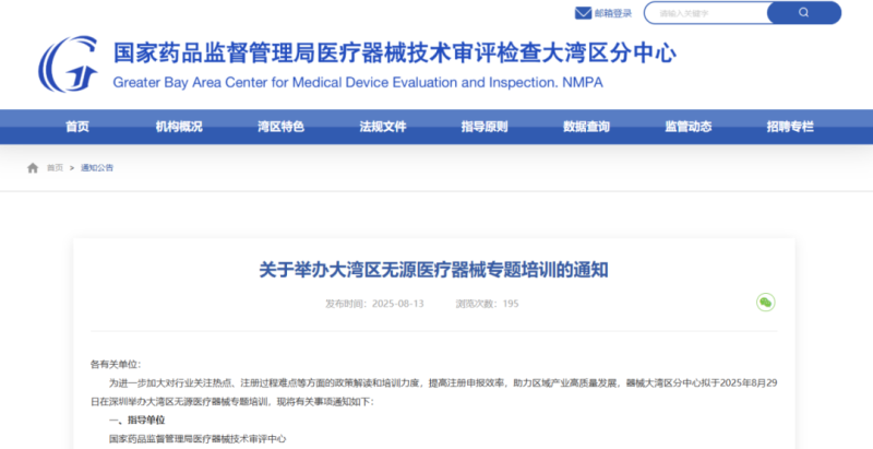 近日,國家藥監局醫療器械技術審評檢查大灣區分中心發布通知,定於8月29日(周五)舉辦“大灣區無源醫療器械專題培訓”線上主題谘詢開放日活動,具體培訓內容及報名方式如下: