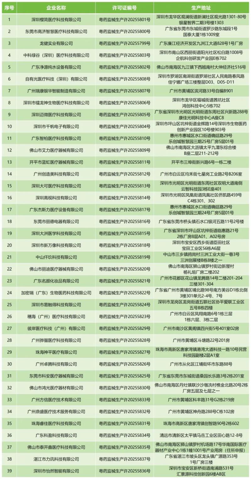 近日,廣東省藥監局公布了《2025年7月醫療器械生產許可證核發清單》,據該公開數據顯示,2025年7月,中科綠穀(深圳)醫療科技有限公司、自有光醫療科技(深圳)有限公司、東莞市麗德電器有限公司、彼岸醫療科技(廣州)有限公司等共計39家企業新拿到了醫療器械生產許可證,具體明細如下: