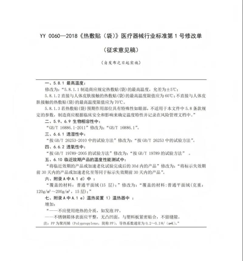 近日,國家藥監局醫療器械標管中心發布YY 0060-2018《熱敷貼(袋)》醫療器械行業標準第1號修改單,並向社會公開征求意見。
