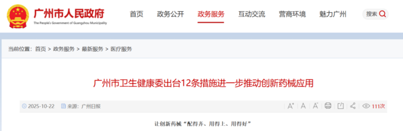 日前,廣州市衛生健康委印發《廣州市衛生健康委員會進一步推動創新藥械應用十二條措施》(以下簡稱《措施》),從暢通創新藥械入院全流程、加強創新藥械臨床推廣應用、優化創新藥械發展生態三方麵推出措施,以提升疾病診療水平與醫療服務能力,保障人民健康,讓創新藥械在廣州“配得齊、用得上、用得好”。 一、暢通創新藥械入院全流程